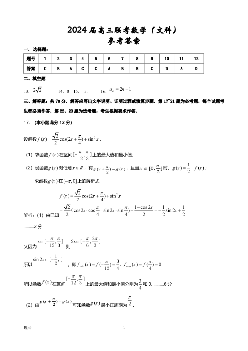 陕西省宝鸡实验高级中学2024届高三上学期12月联考 文数答案