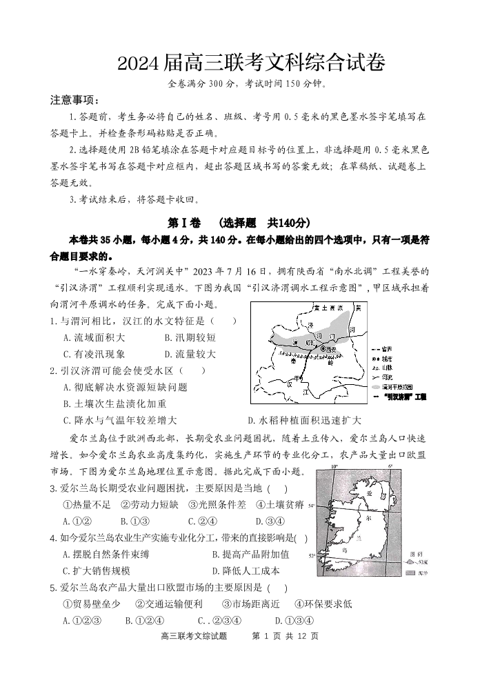 陕西省宝鸡实验高级中学2024届高三上学期12月联考 文综
