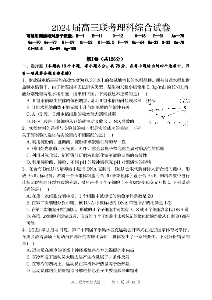陕西省宝鸡实验高级中学2024届高三上学期12月联考 理综