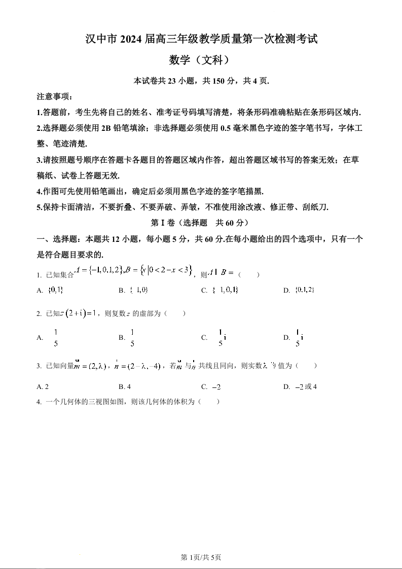 陕西省宝鸡实验高级中学2024届高三上学期12月联考数学(文)(原卷版)