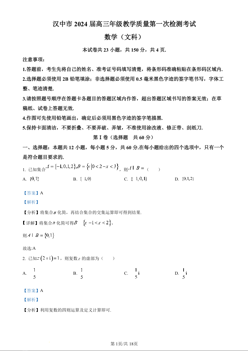 陕西省宝鸡实验高级中学2024届高三上学期12月联考数学(文)(精品解析版)