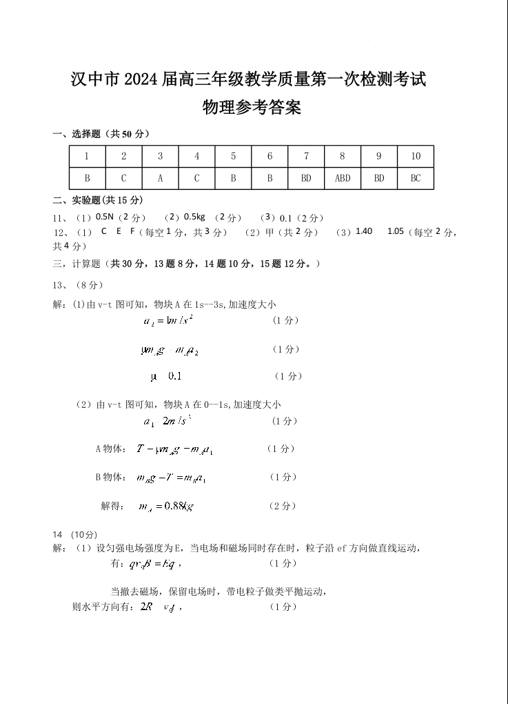 陕西省宝鸡实验高级中学2024届高三上学期12月联考物理答案