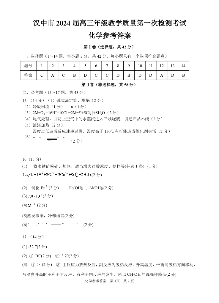 陕西省宝鸡实验高级中学2024届高三上学期12月联考化学答案