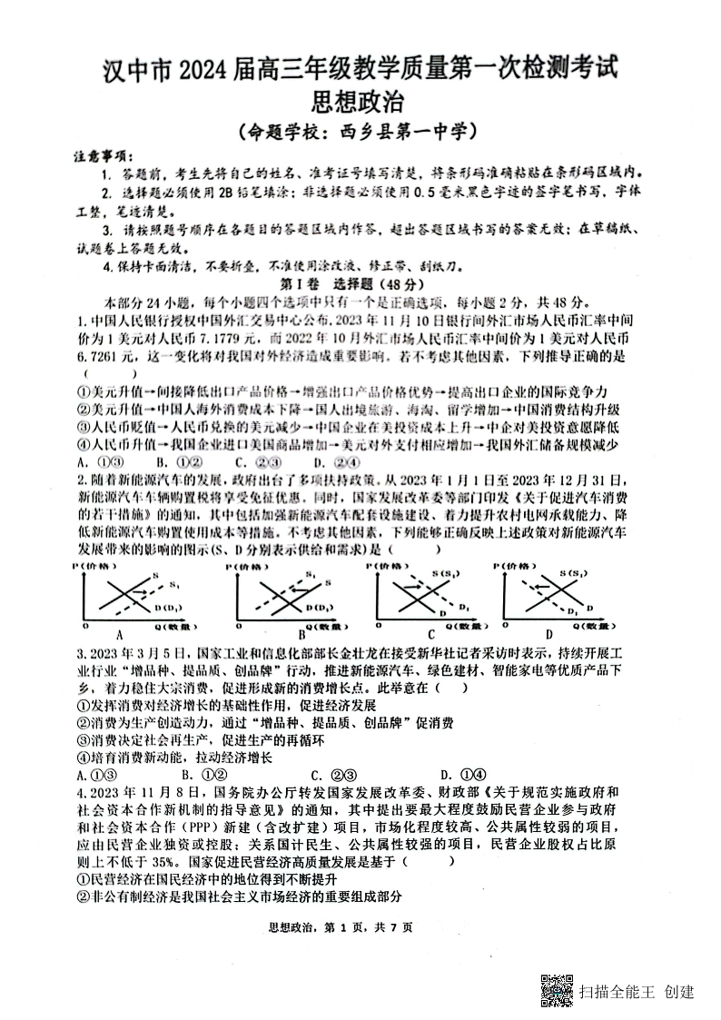 陕西省宝鸡实验高级中学2024届高三上学期12月联考政治