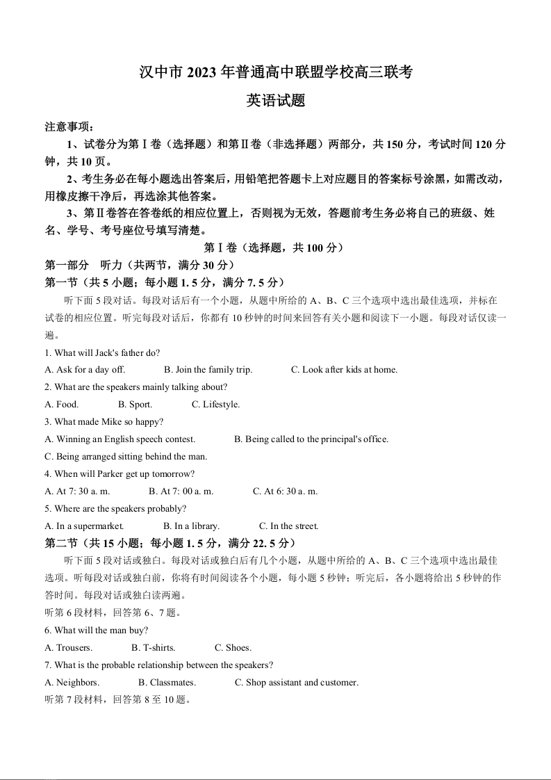 陕西省汉中市普通高中联盟2024届高三上学期期中联考英语