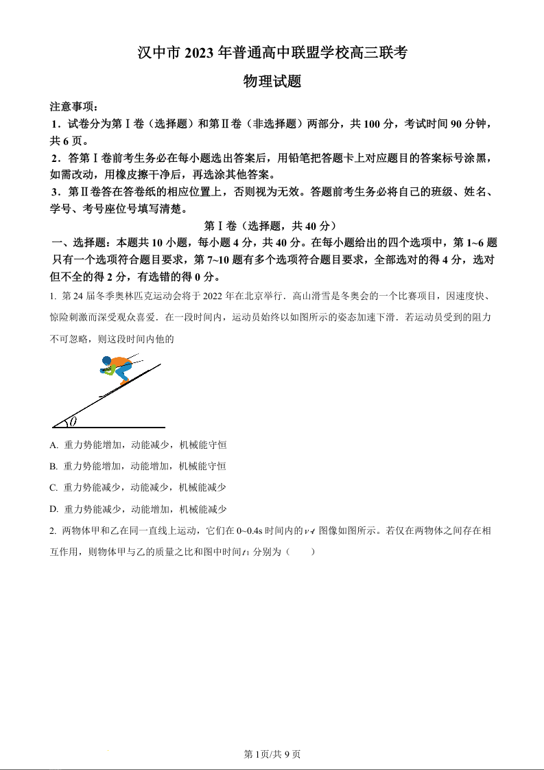 陕西省汉中市普通高中联盟2024届高三上学期期中联考物理(原卷版)
