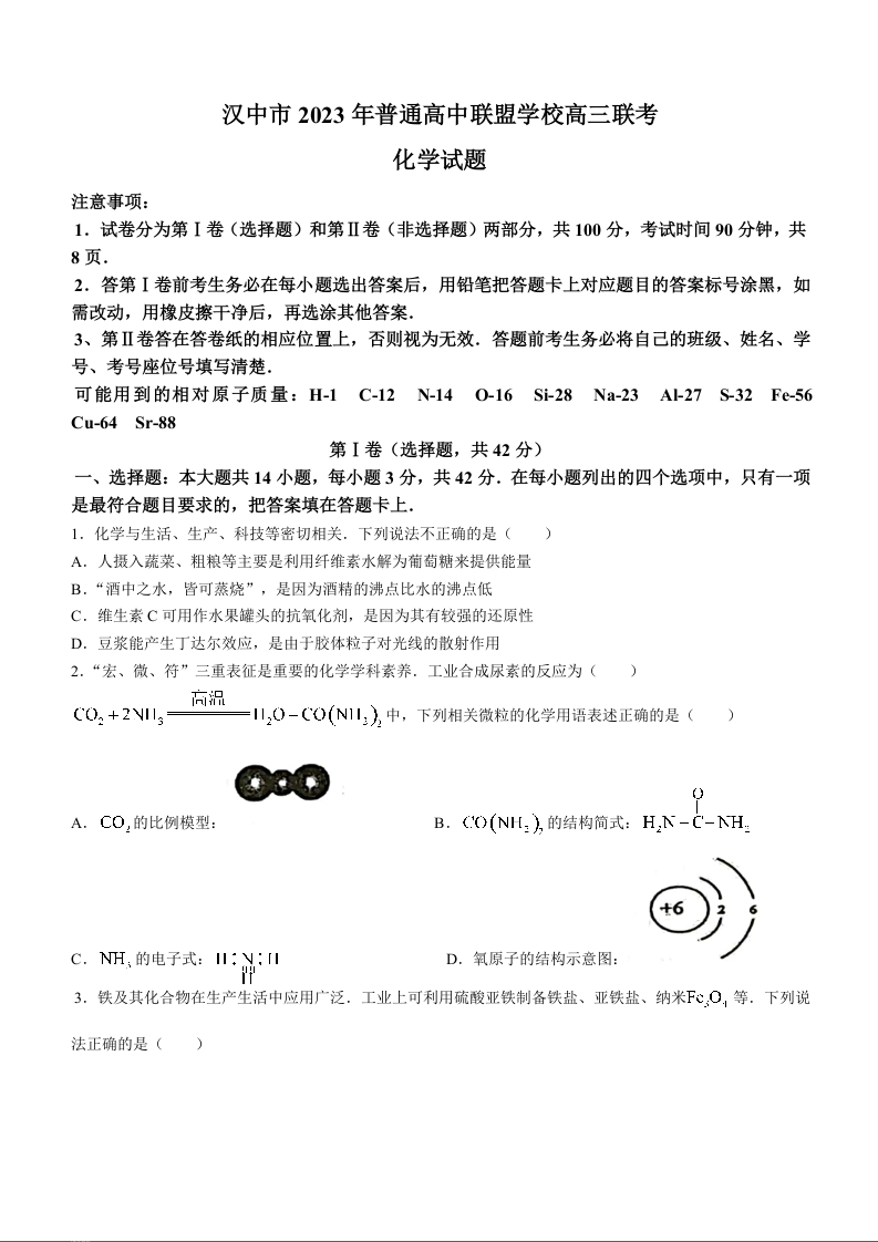 陕西省汉中市普通高中联盟2024届高三上学期期中联考化学