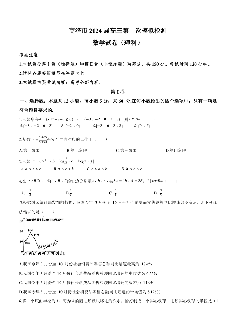 陕西省商洛市2024届高三上学期第一次模拟检测理科数学含答案