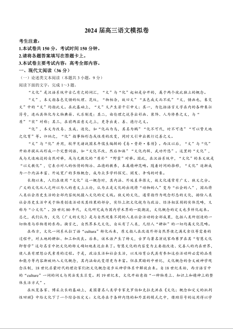 陕西省西安市长安区教育片区2024届高三上学期模拟考试语文