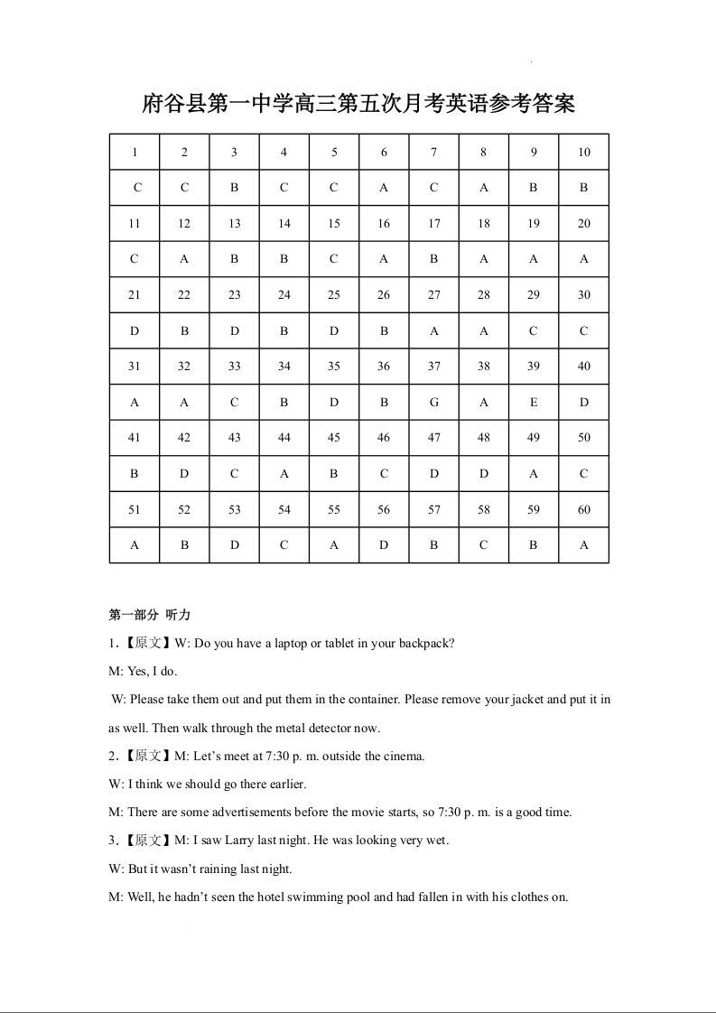陕西省榆林市府谷县第一中学2023-2024学年高三上学期12月月考 英语答案