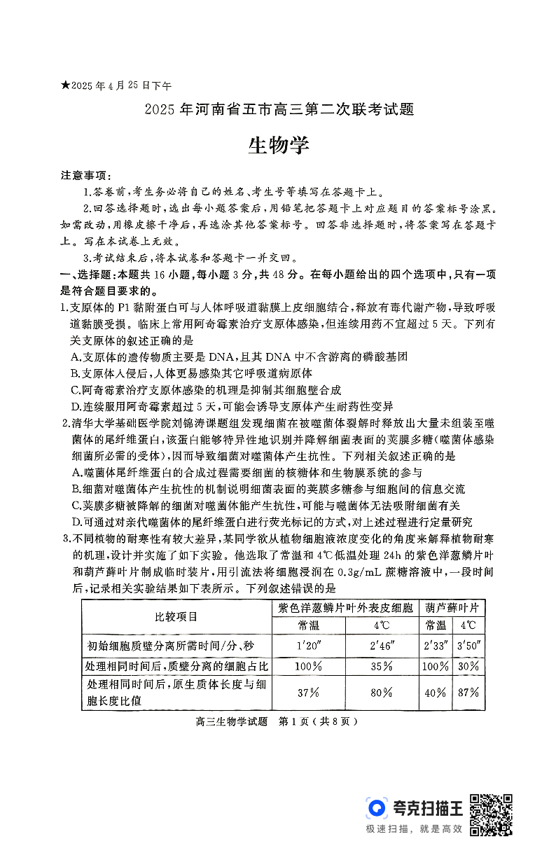 河南省五市2025届高三第二次联考(许平南新洛)生物