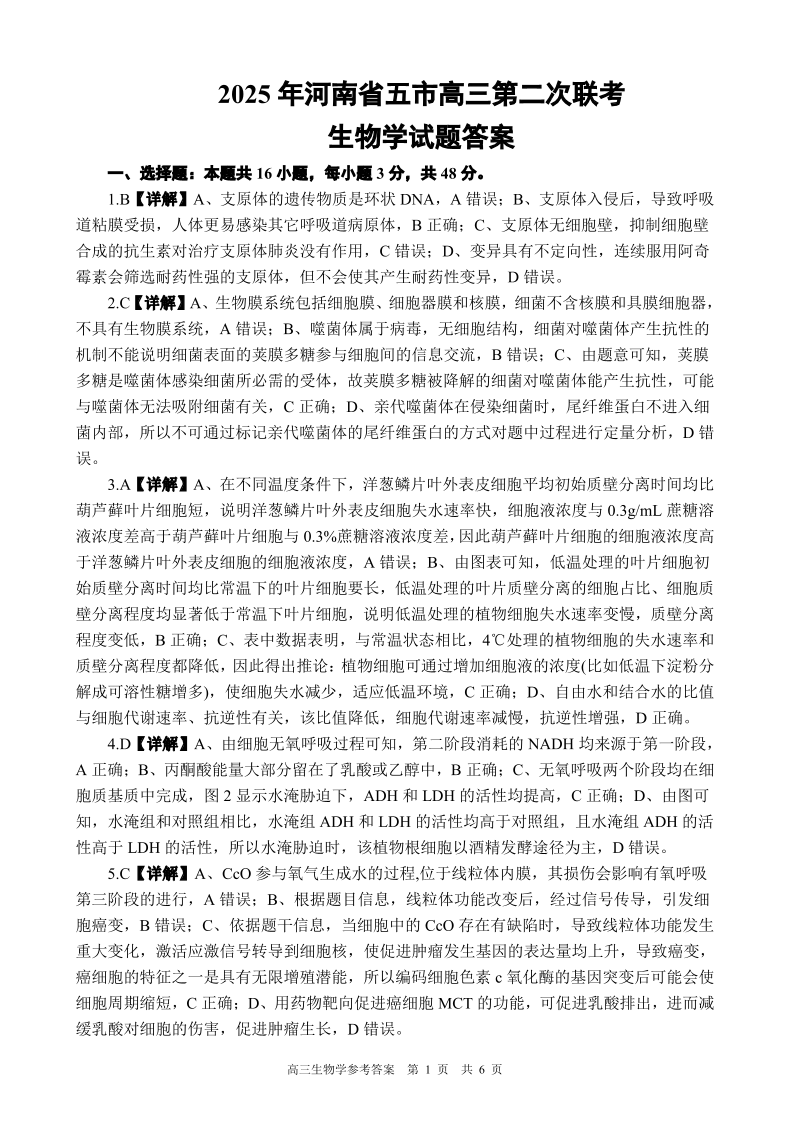 河南省五市2025届高三第二次联考(许平南新洛)生物答案