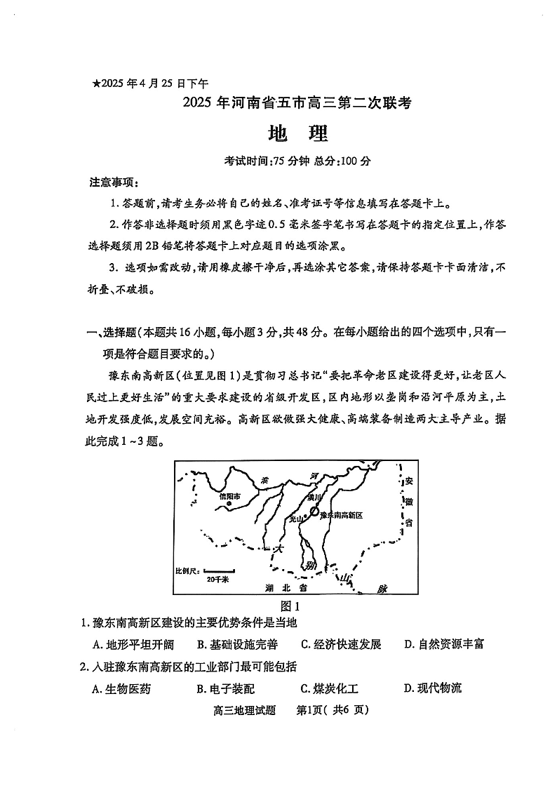 河南省五市2025届高三第二次联考(许平南新洛)地理