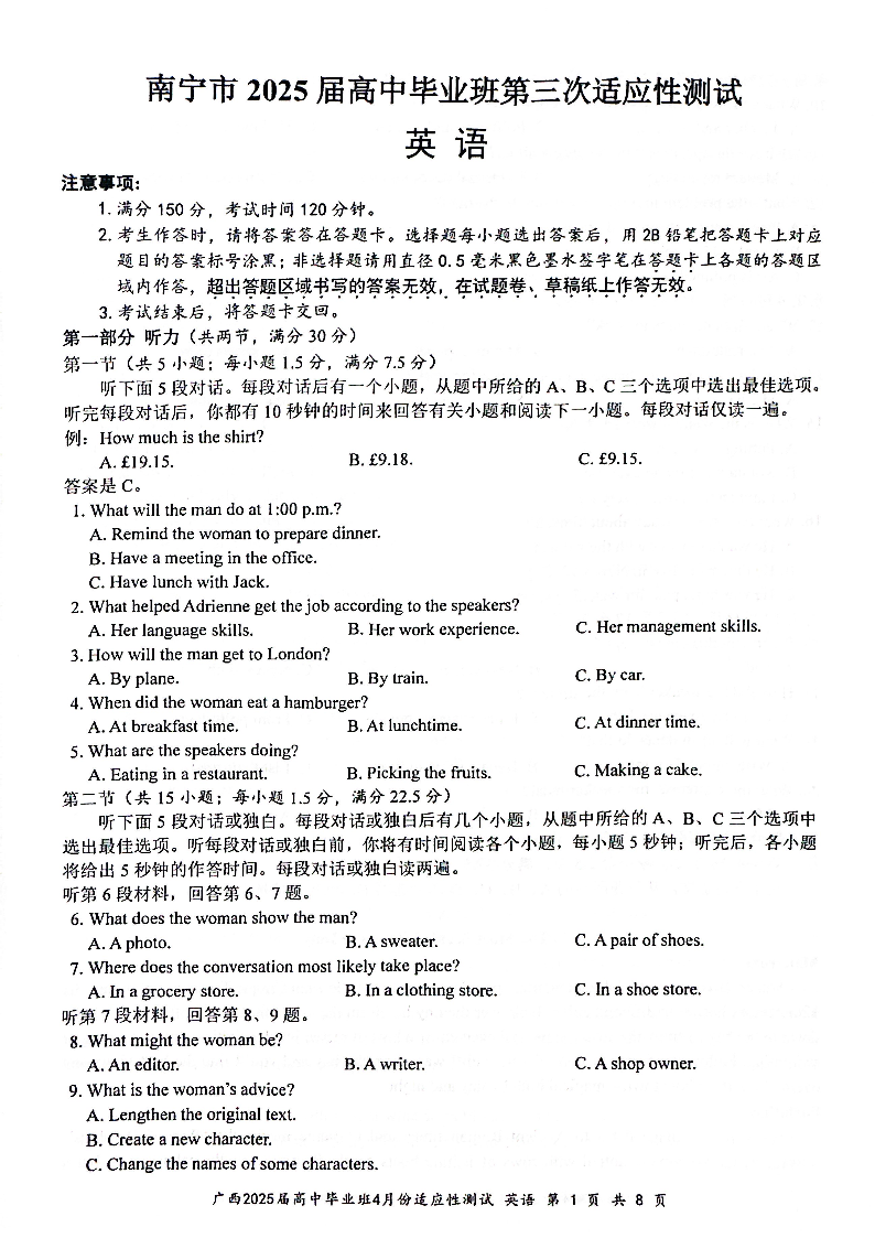 广西壮族自治区南宁市2025届普通高中毕业班第二次适应性测试英语