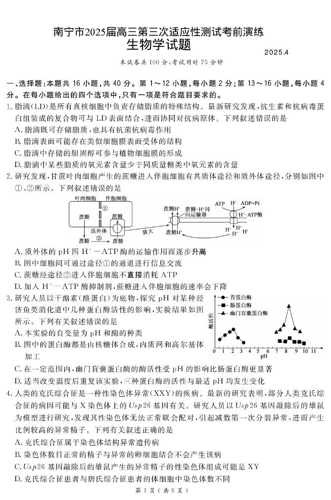 广西壮族自治区南宁市2025届普通高中毕业班第二次适应性测试生物+答案
