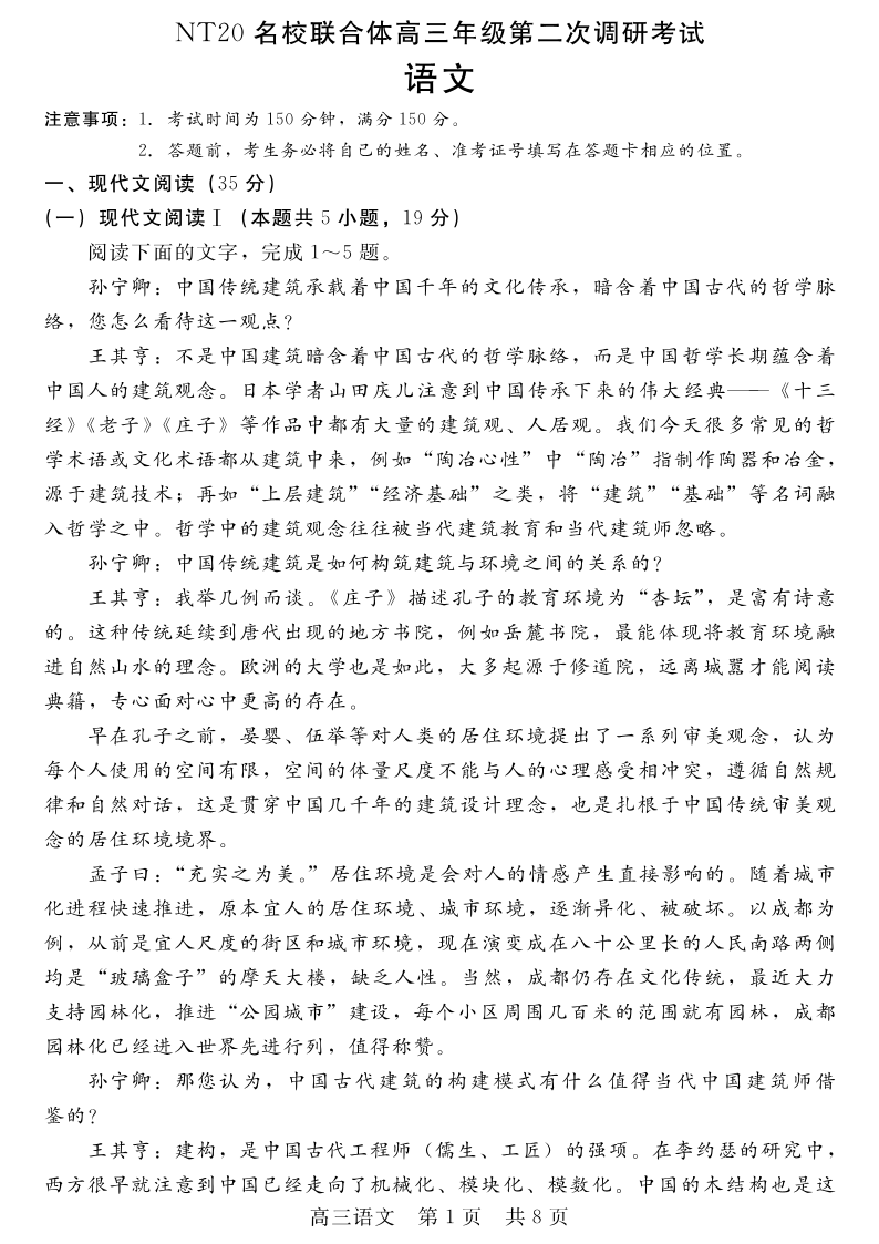 河北省NT20名校联合体2025届高三年级第二次调研考试语文