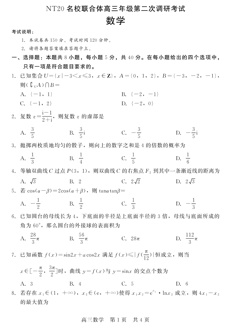 河北省NT20名校联合体2025届高三年级第二次调研考试数学