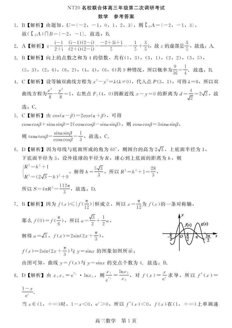 河北省NT20名校联合体2025届高三年级第二次调研考试数学答案