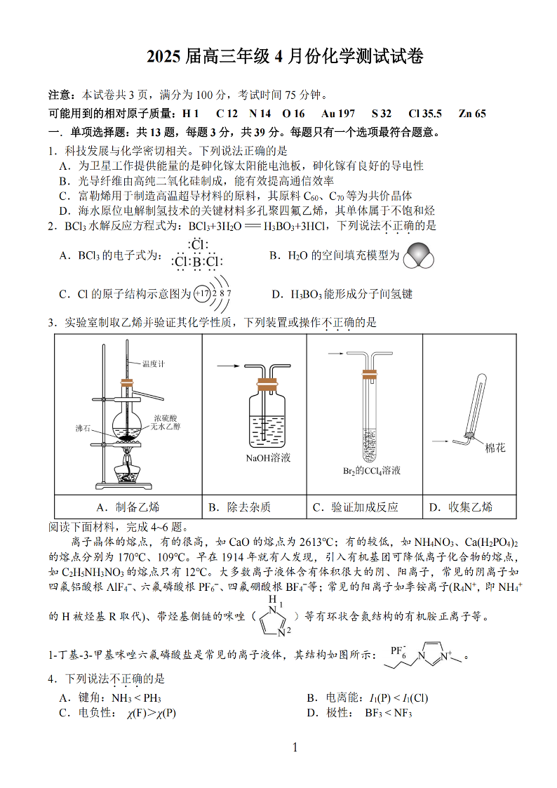 江苏省海安中学、金陵中学、宿迁中学2025届高三下学期4月联考化学+答案