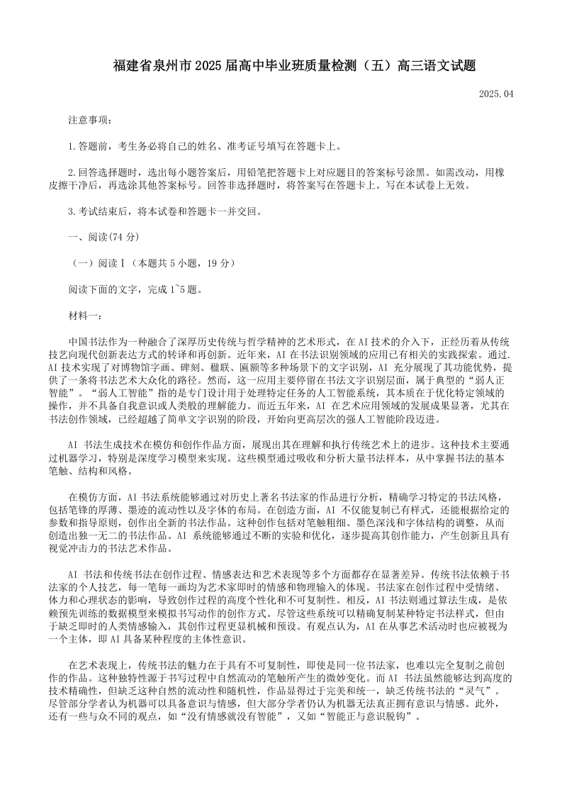 福建省泉州市2024-2025届高中毕业班适应性练习(四检)语文+答案