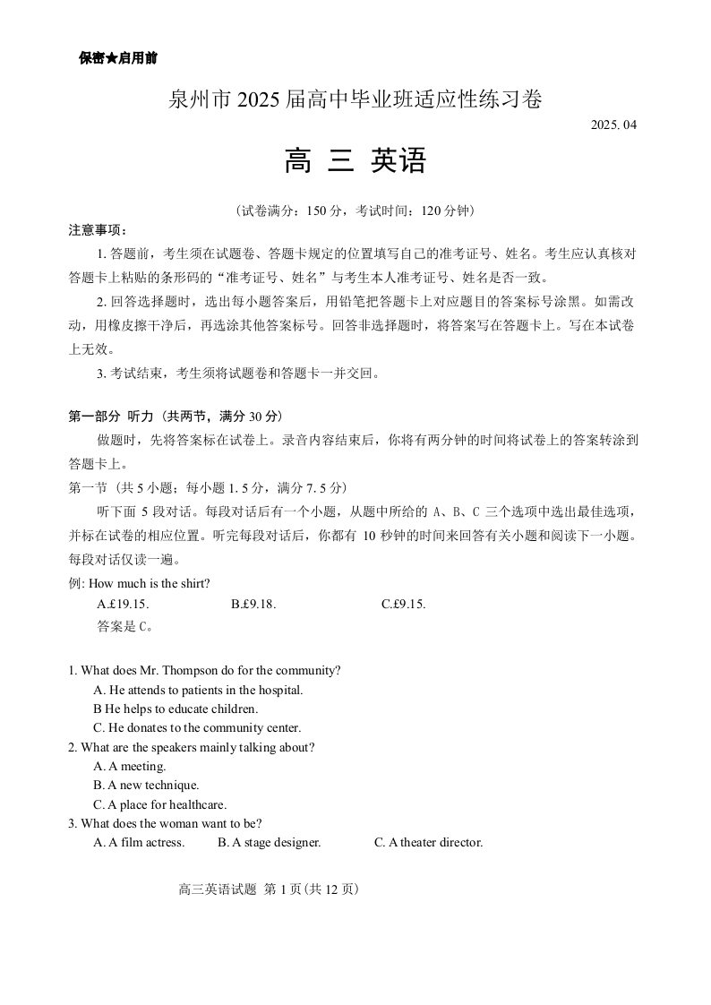 福建省泉州市2024-2025届高中毕业班适应性练习(四检)英语+答案