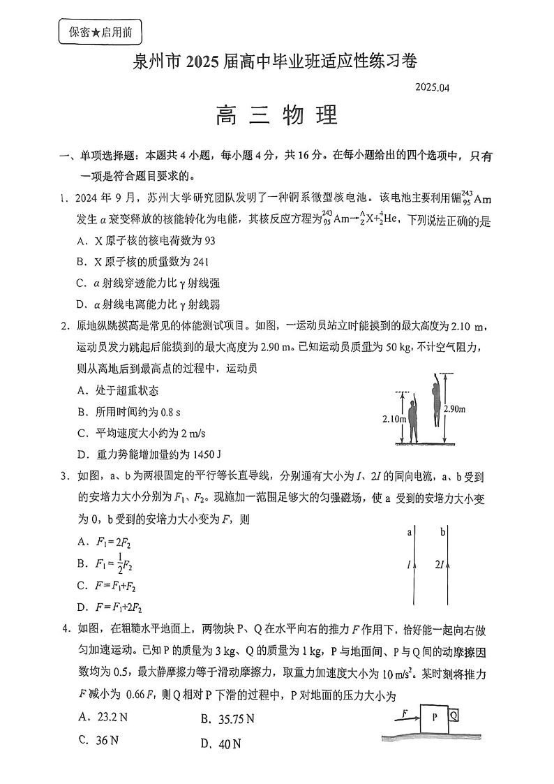 福建省泉州市2024-2025届高中毕业班适应性练习(四检)物理