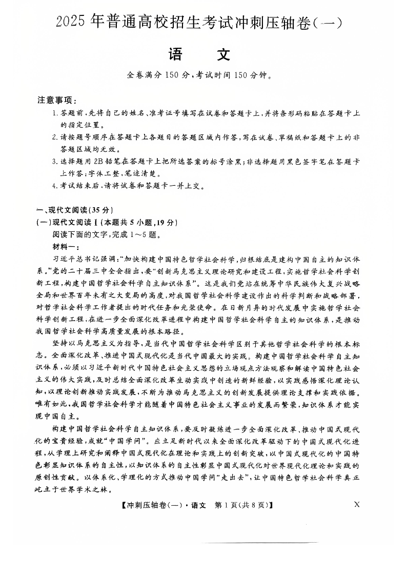 山东省区域高中2025年普通高校招生考试冲刺压轴卷(一)语文+答案