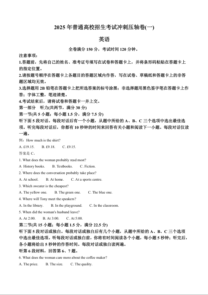 山东省区域高中2025年普通高校招生考试冲刺压轴卷(一)英语(解析版)