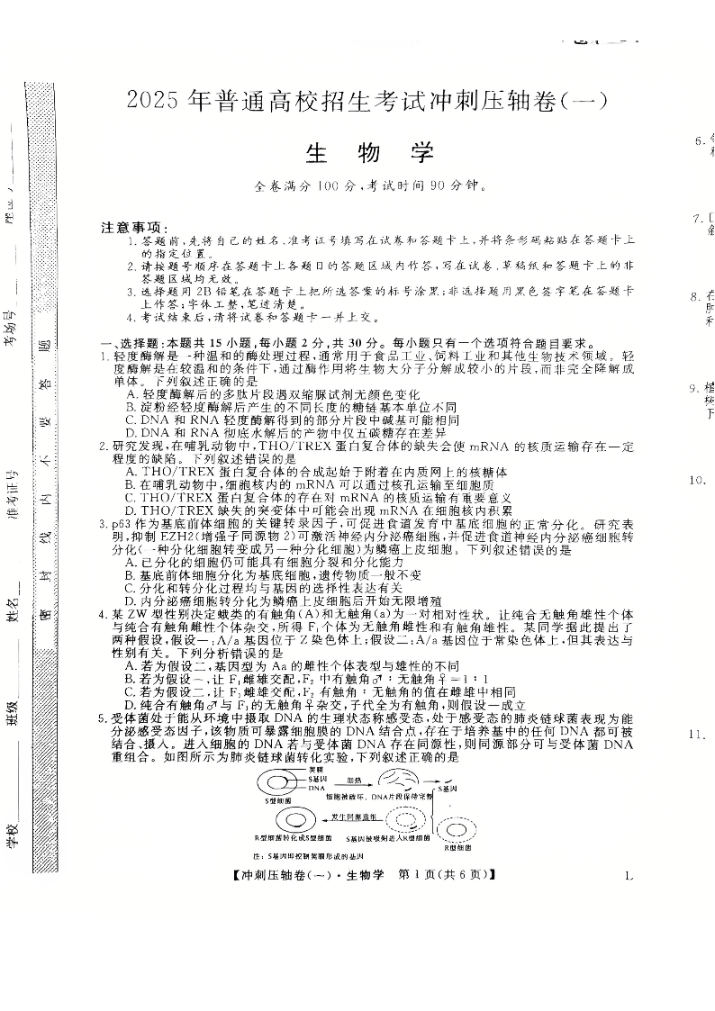 山东省区域高中2025年普通高校招生考试冲刺压轴卷(一)生物+答案