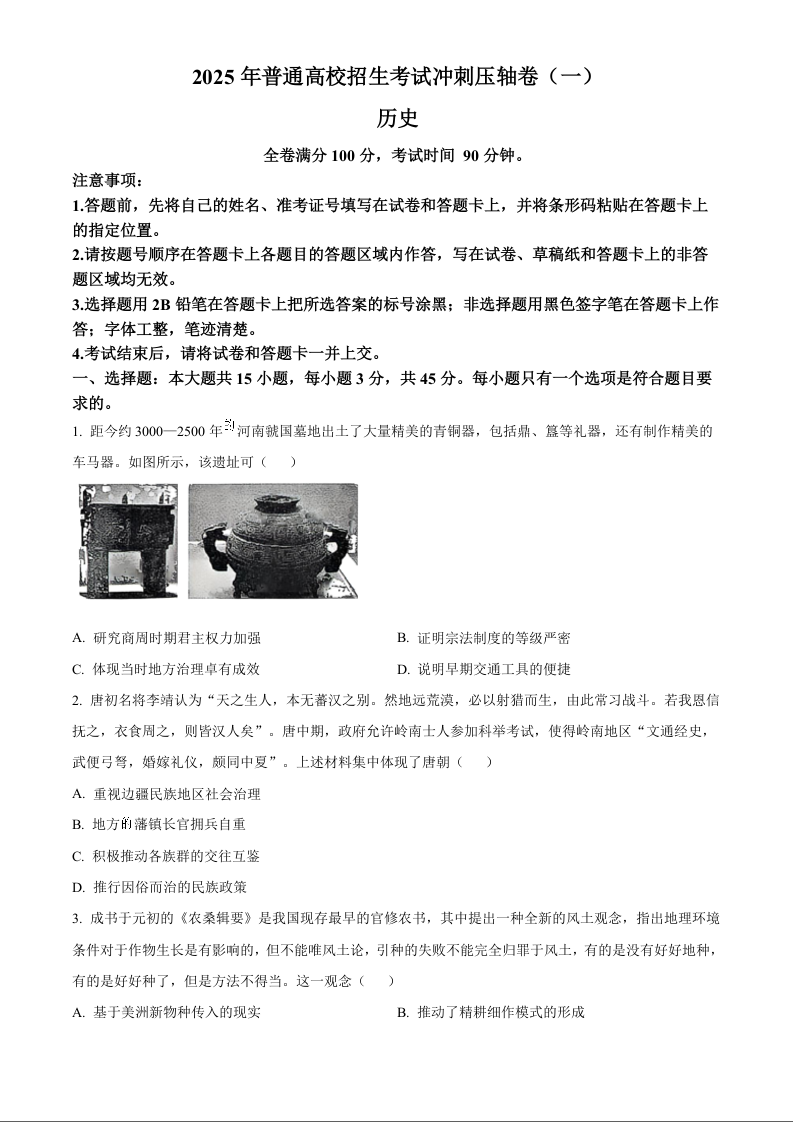 山东省区域高中2025年普通高校招生考试冲刺压轴卷(一)历史(原卷版)