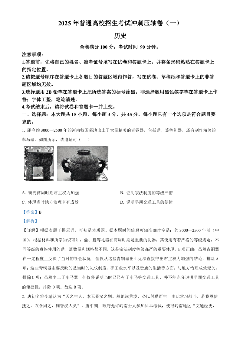 山东省区域高中2025年普通高校招生考试冲刺压轴卷(一)历史(解析版)