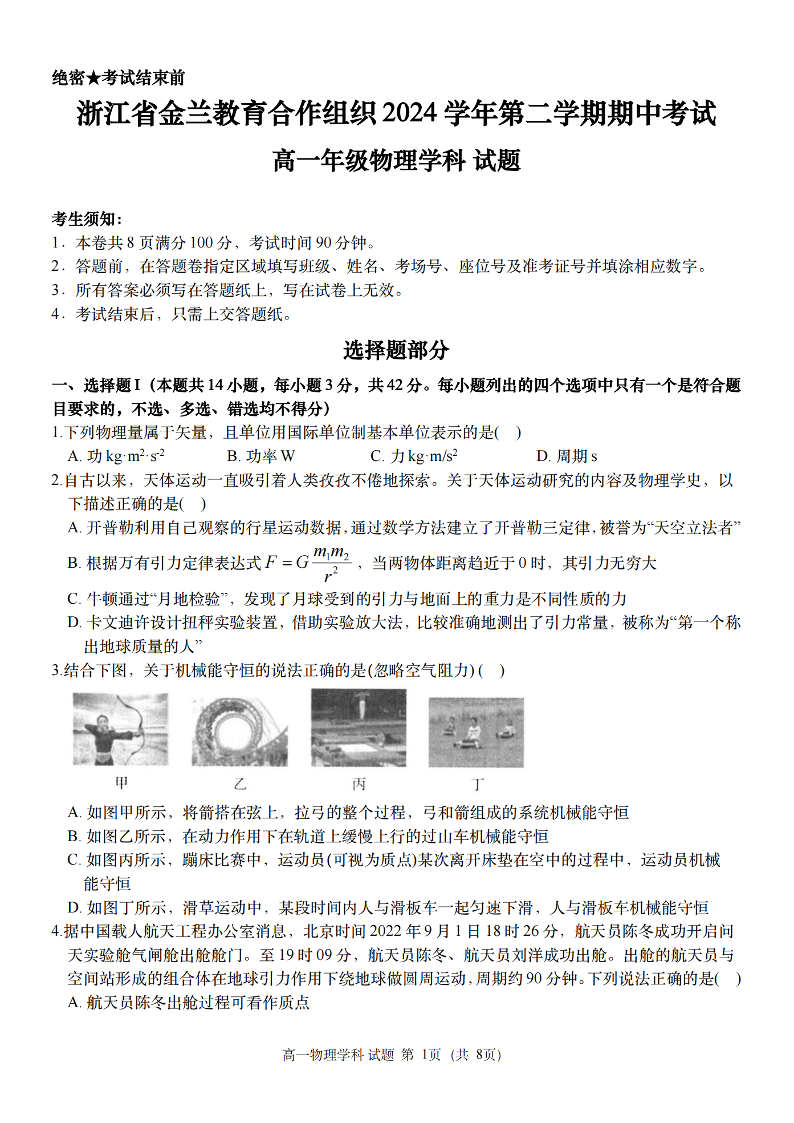 浙江省宁波市金兰教合组织2024-2025学年下学期4月高一期中联考物理+答案