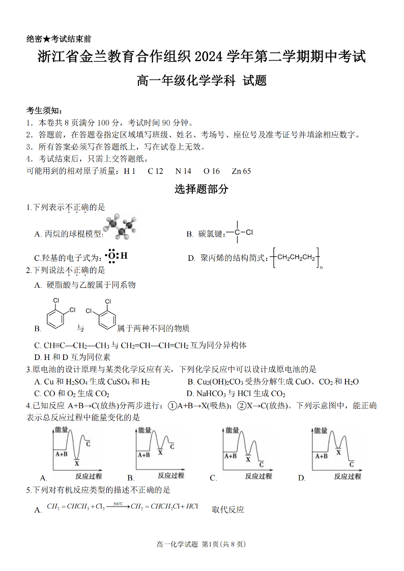 浙江省宁波市金兰教合组织2024-2025学年下学期4月高一期中联考化学+答案