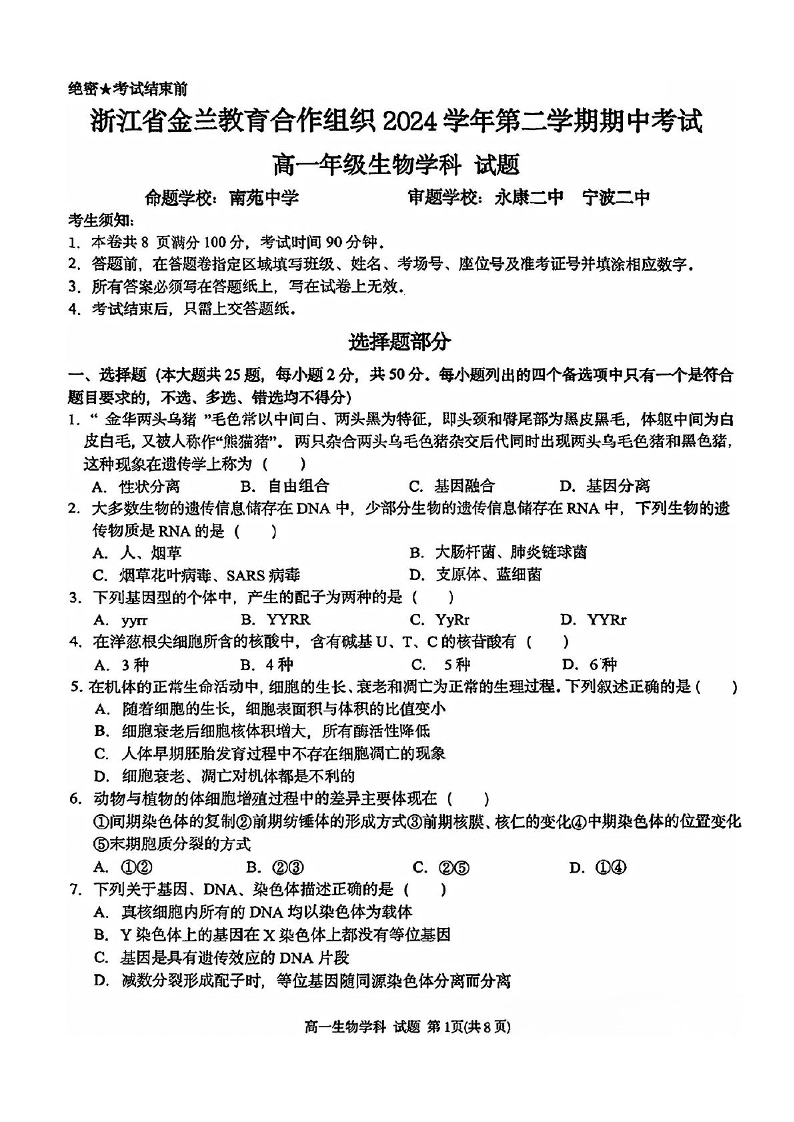 浙江省宁波市金兰教合组织2024-2025学年下学期4月高一期中联考生物+答案