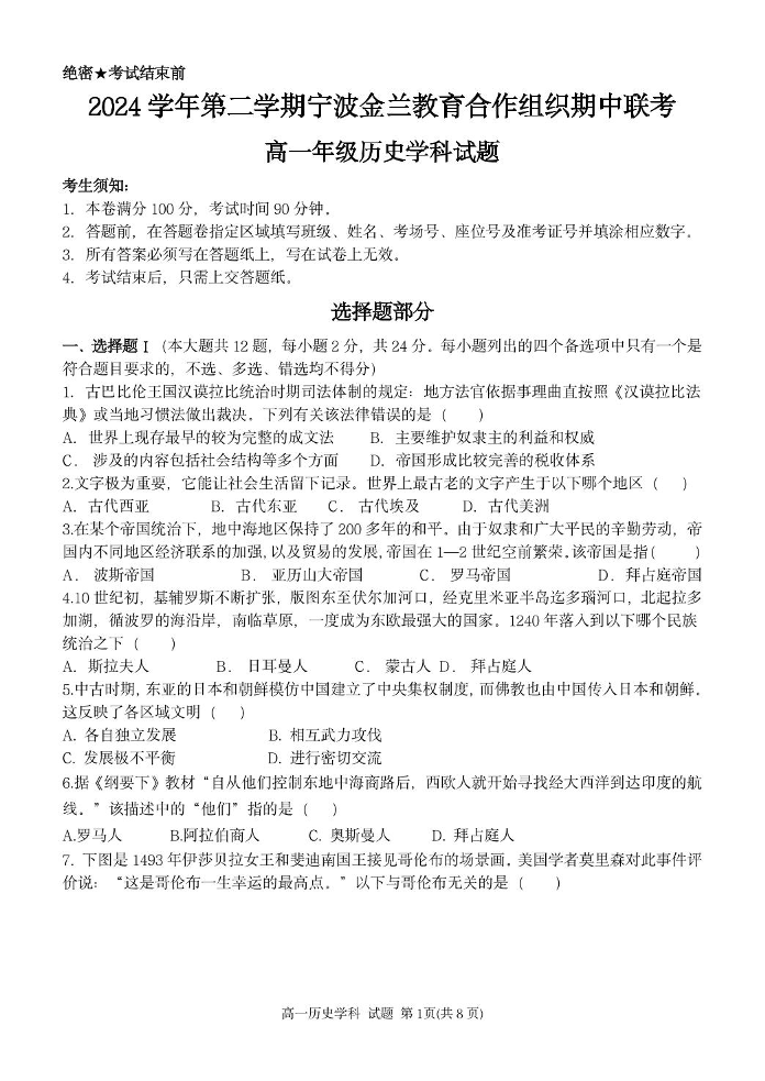 浙江省宁波市金兰教合组织2024-2025学年下学期4月高一期中联考历史