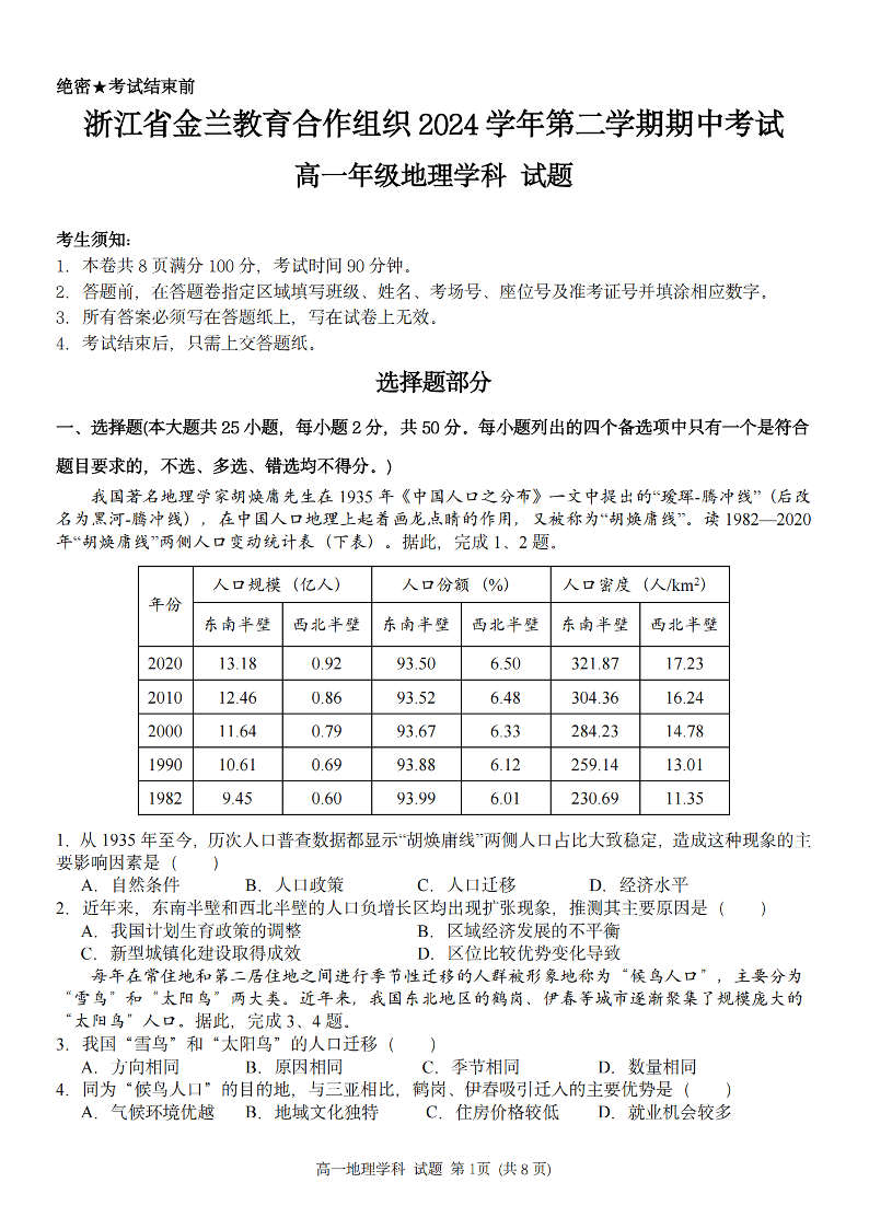 浙江省宁波市金兰教合组织2024-2025学年下学期4月高一期中联考地理+答案