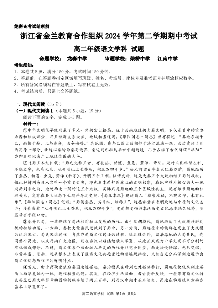浙江省宁波市金兰教合组织2024-2025学年下学期4月高二期中联考语文
