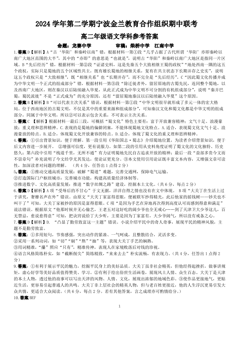 浙江省宁波市金兰教合组织2024-2025学年下学期4月高二期中联考语文答案