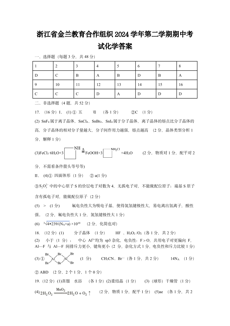 浙江省宁波市金兰教合组织2024-2025学年下学期4月高二期中联考化学答案