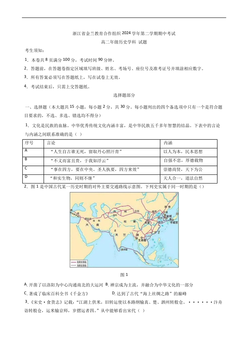 浙江省宁波市金兰教合组织2024-2025学年下学期4月高二期中联考历史+答案