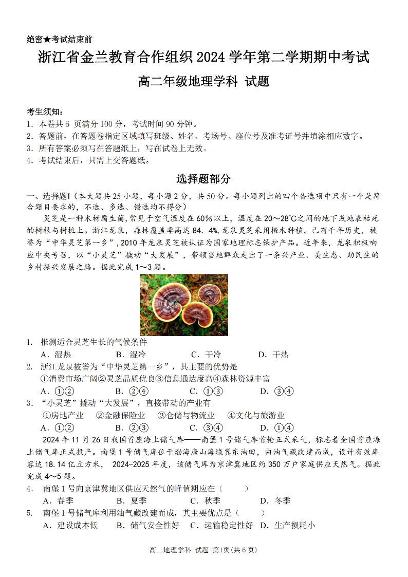 浙江省宁波市金兰教合组织2024-2025学年下学期4月高二期中联考地理+答案