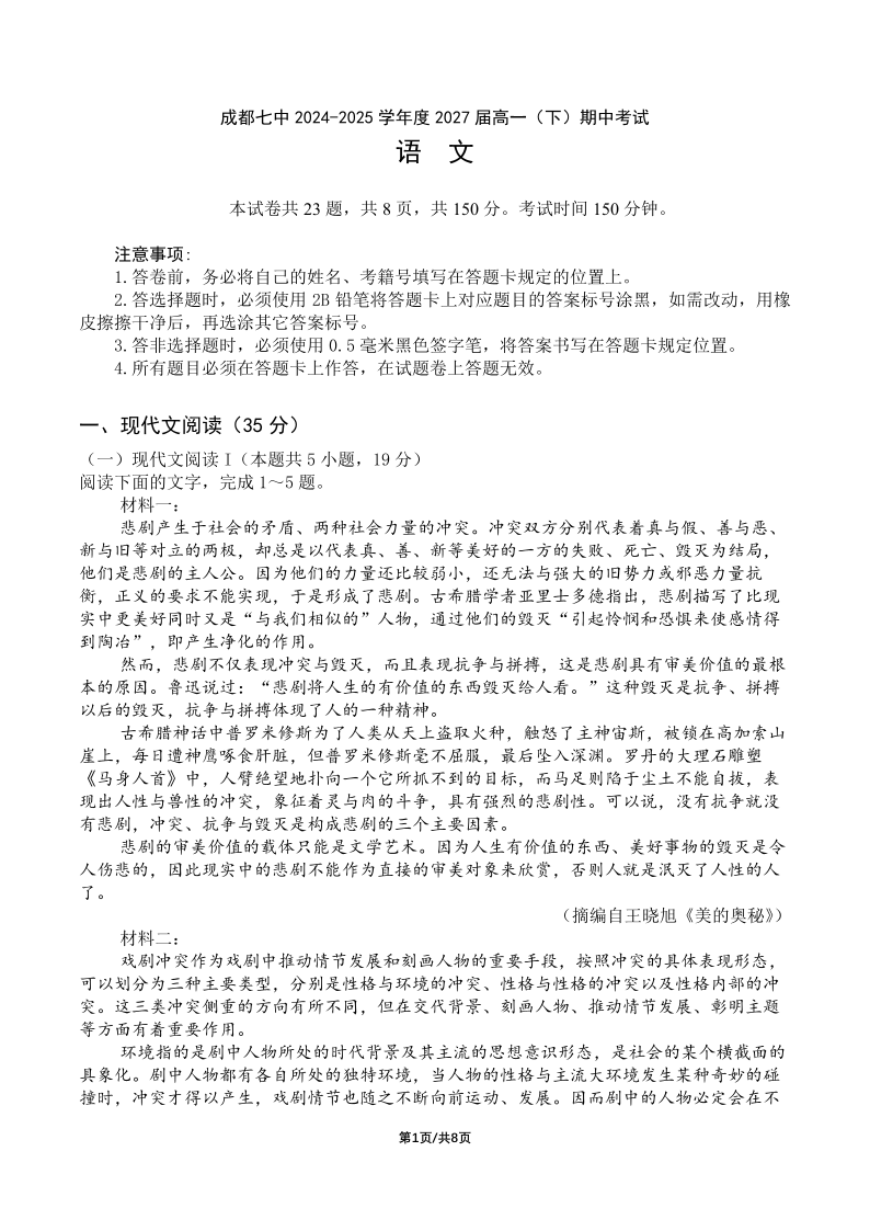 四川省成都市第七中学2024-2025学年下期高一半期考试语文