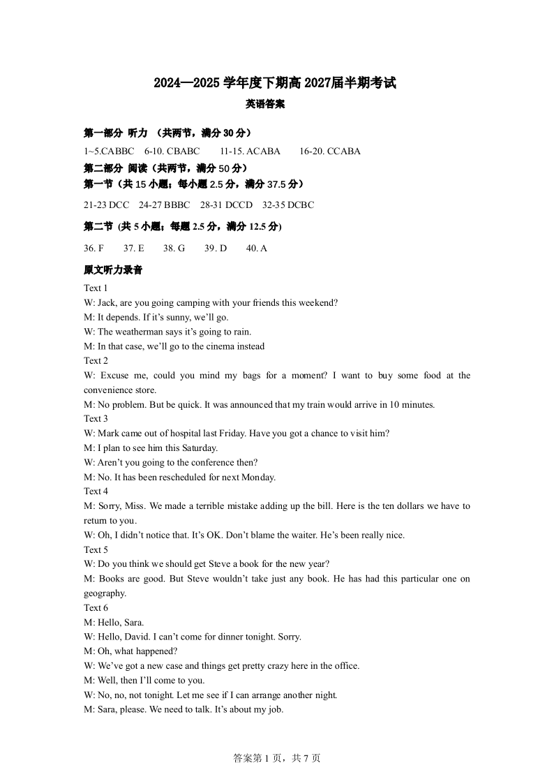 四川省成都市第七中学2024-2025学年下期高一半期考试英语答案