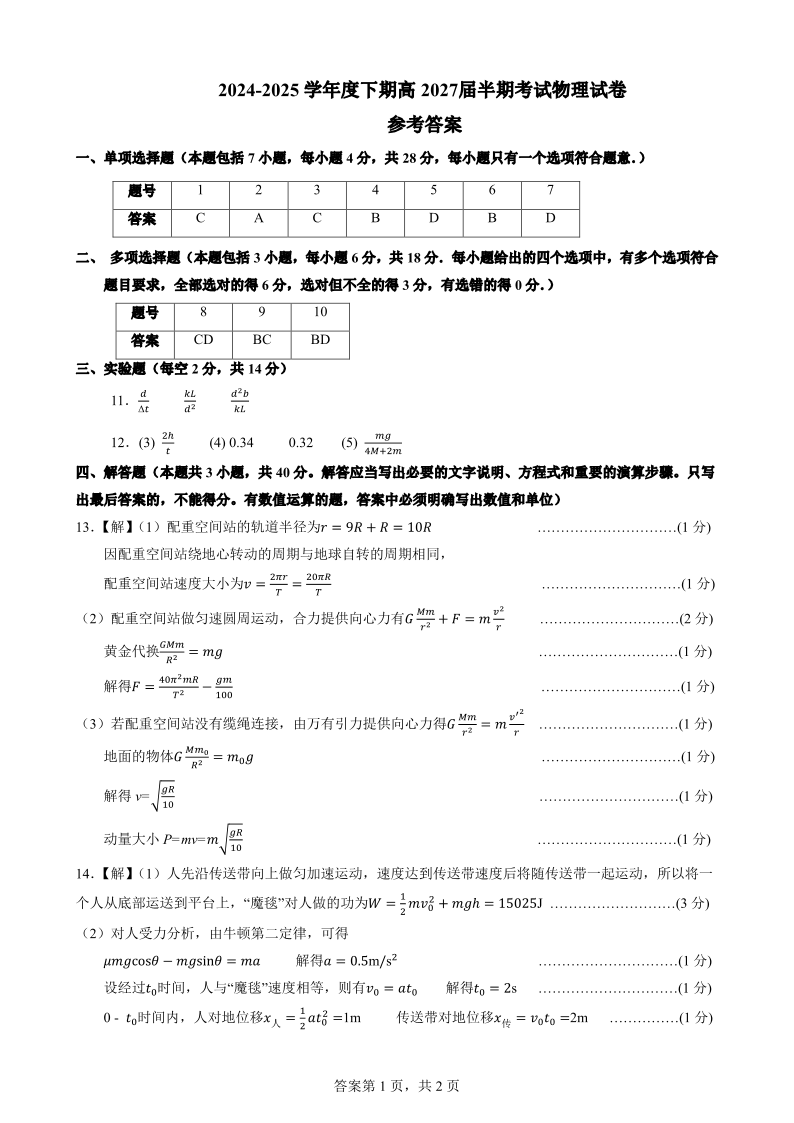 四川省成都市第七中学2024-2025学年下期高一半期考试物理答案