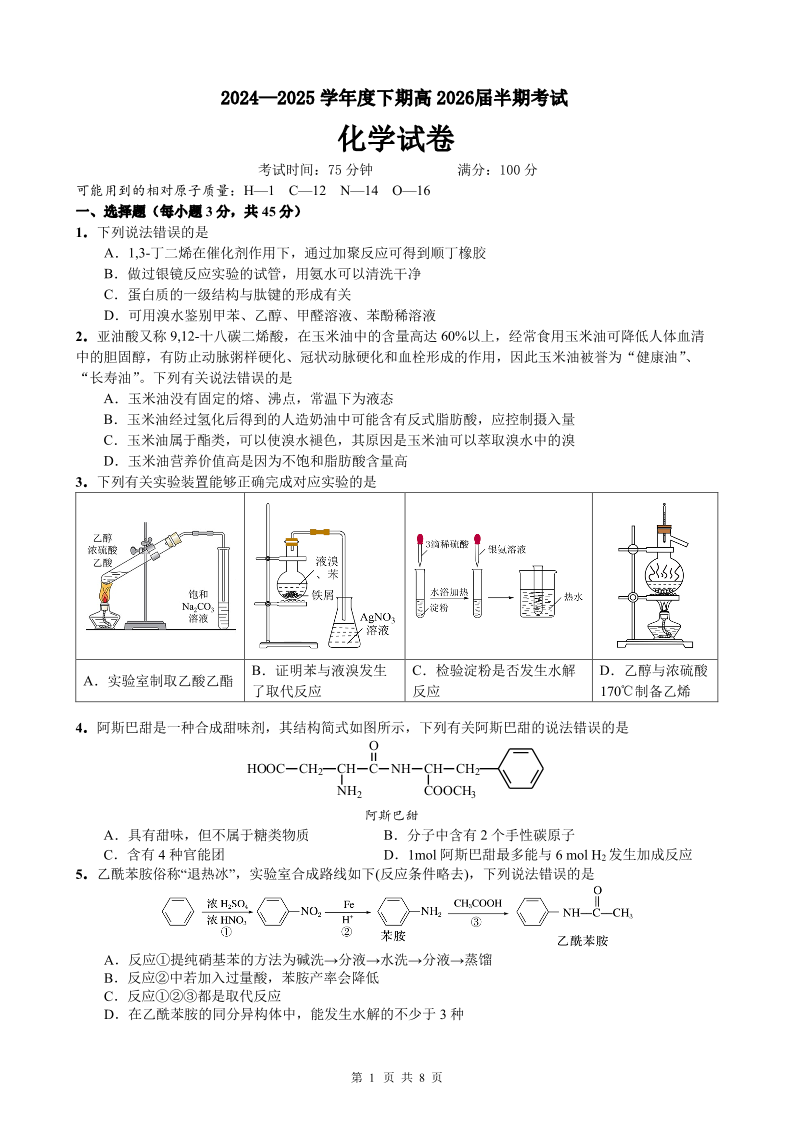 四川省成都市第七中学2024-2025学年下期高二半期考试化学
