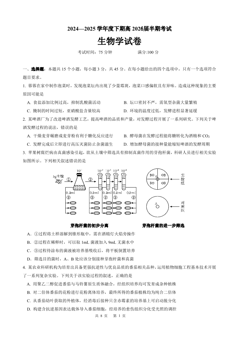 四川省成都市第七中学2024-2025学年下期高二半期考试生物