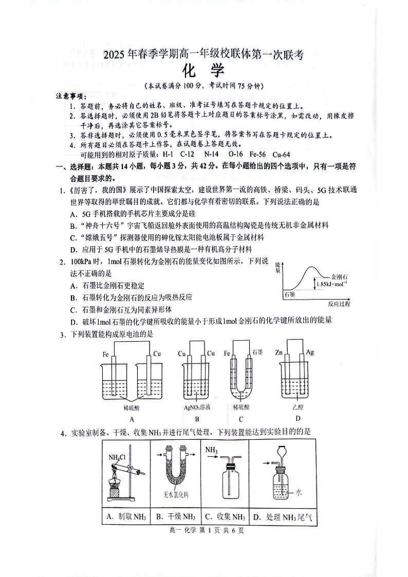 广西壮族自治区河池市十校联体2024-2025学年下学期高一第一次联考化学+答案