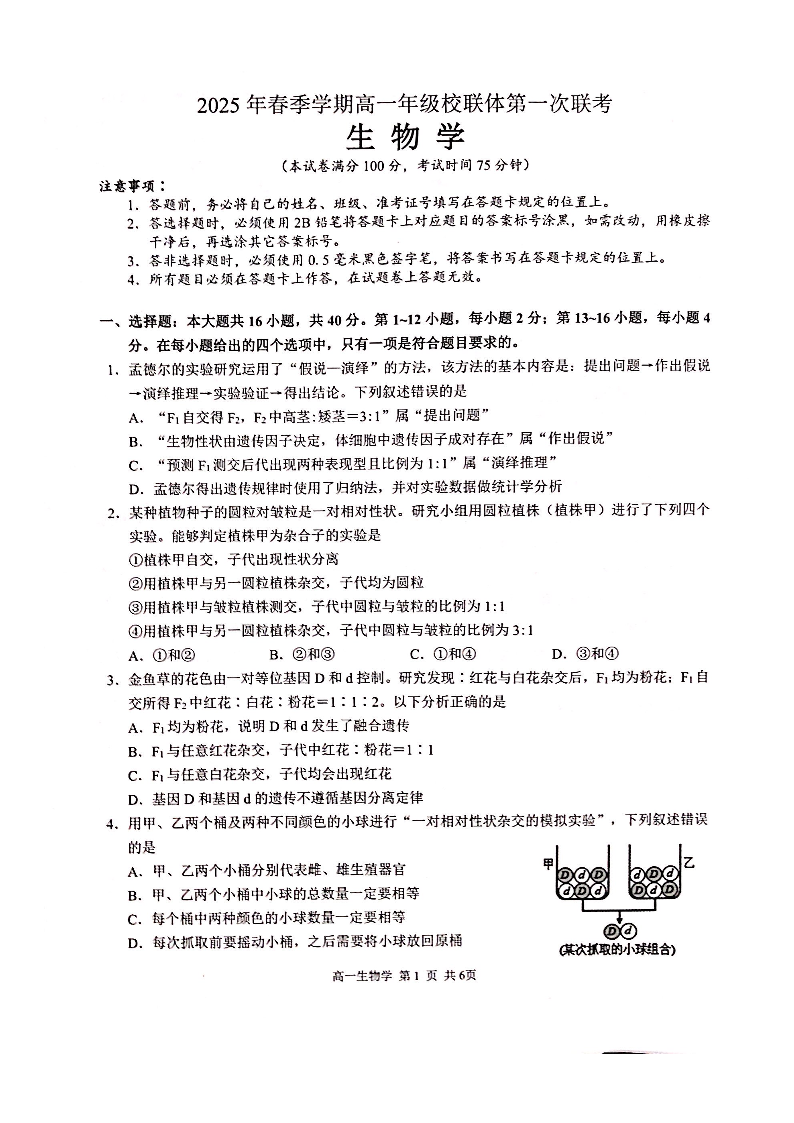 广西壮族自治区河池市十校联体2024-2025学年下学期高一第一次联考生物+答案