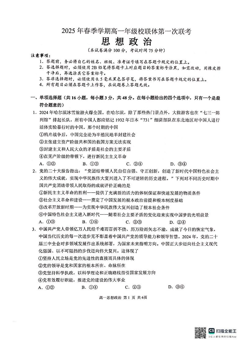 广西壮族自治区河池市十校联体2024-2025学年下学期高一第一次联考政治