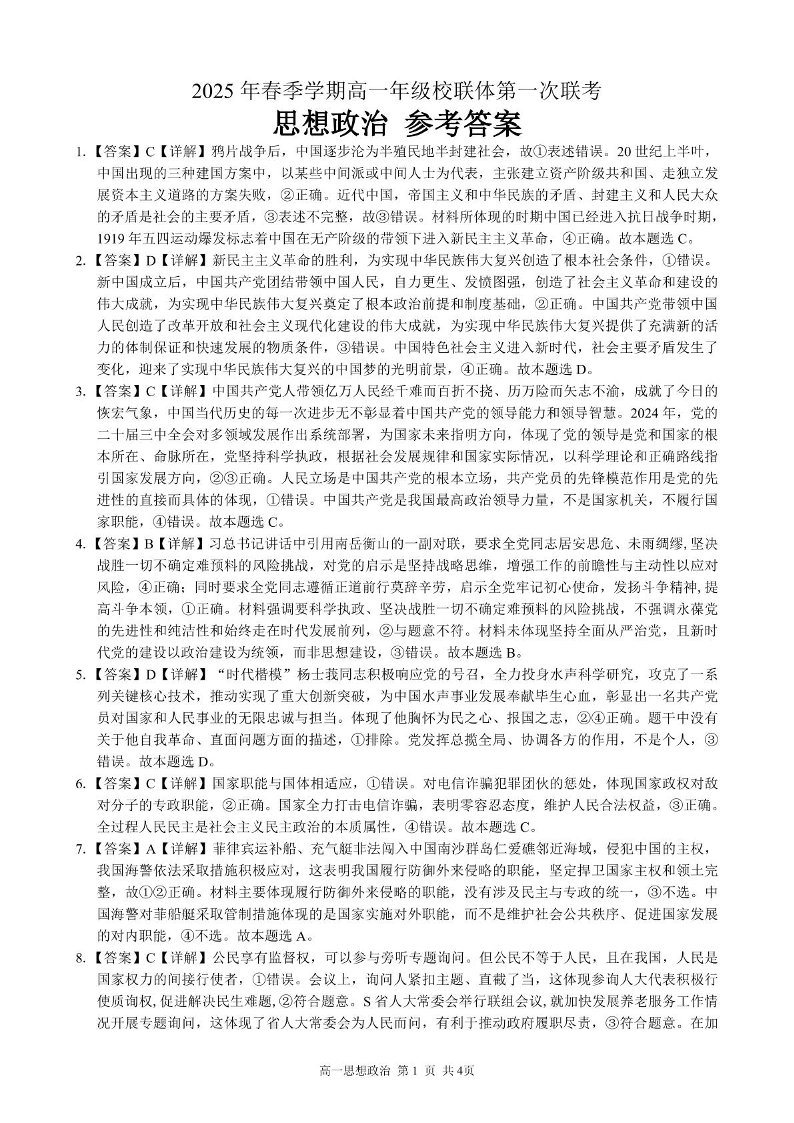 广西壮族自治区河池市十校联体2024-2025学年下学期高一第一次联考政治答案